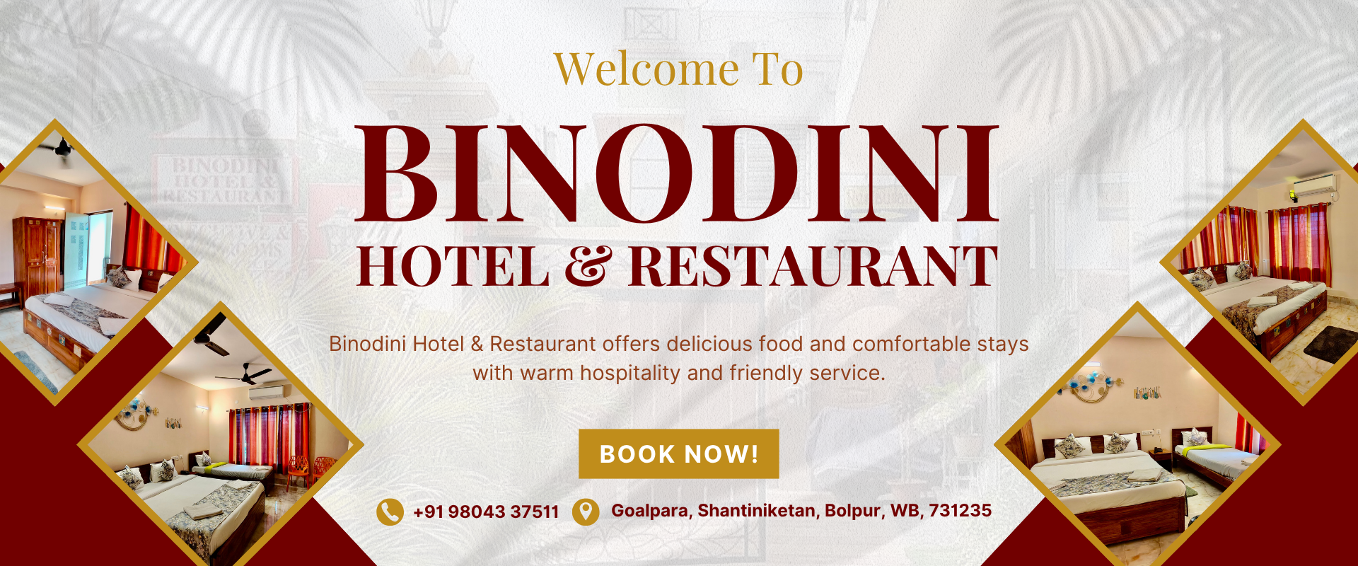 Welcome to Binodini Hotel and Restaurant, your serene retreat nestled in the heart of Shantiniketan, West Bengal — the land of red earth, soulful melodies, and timeless artistry. Inspired by the profound legacy of Biswakobi Rabindranath Tagore, our hotel offers more than just a place to stay — it offers an experience that celebrates the spirit, culture, and warmth of this unique land.